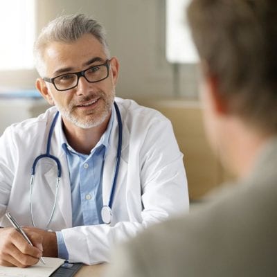 A patient consults with a hip surgeon to determine if anterior hip replacement surgery is right for him.